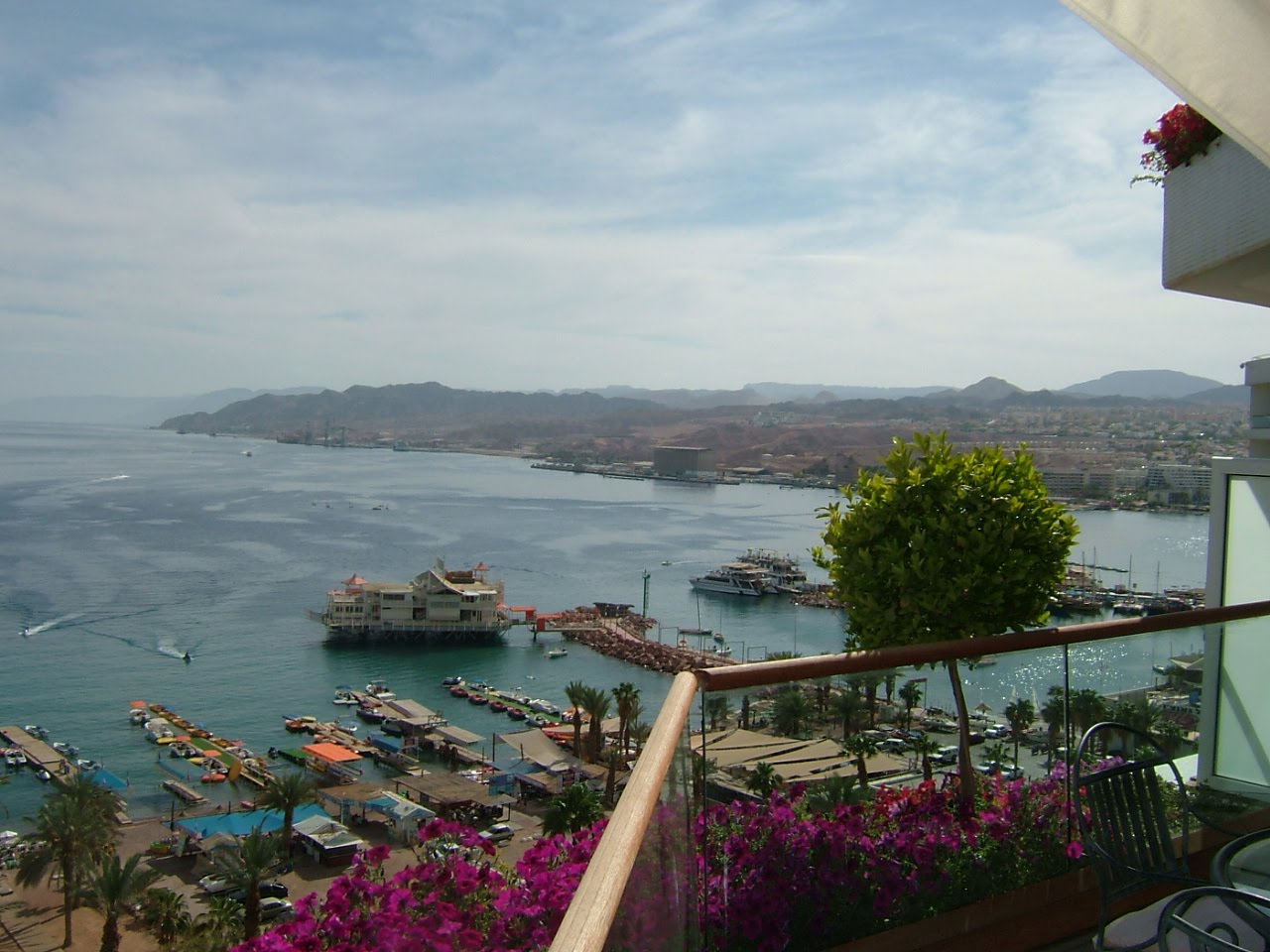 Standing on the balcony, we can see the nations of Jordan, Saudi Arabia, Egypt and of course Israel. The city of Eliat, Israel and the city of Acaba, Jordan share this northernmost tip of the Red Sea as a common deep water port. At least they do in times of peace. Just in case, their is an Israeli PT boat that cruises just beyond the swimming marker!
