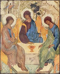 For worship on Trinity Sunday, I’d asked our AV folks to project the image of Rublev’s Trinity onto the two screens that are behind me as I face the congregation to preach. For decades I’ve referred to it as my ‘favorite’ sacred image. Having been raised Catholic, I was not as adverse to sacred images as some Protestants-who misunderstanding, thought people worshiped the icon iteself, rather than what it represented. We’re often afraid of what we do not understand.