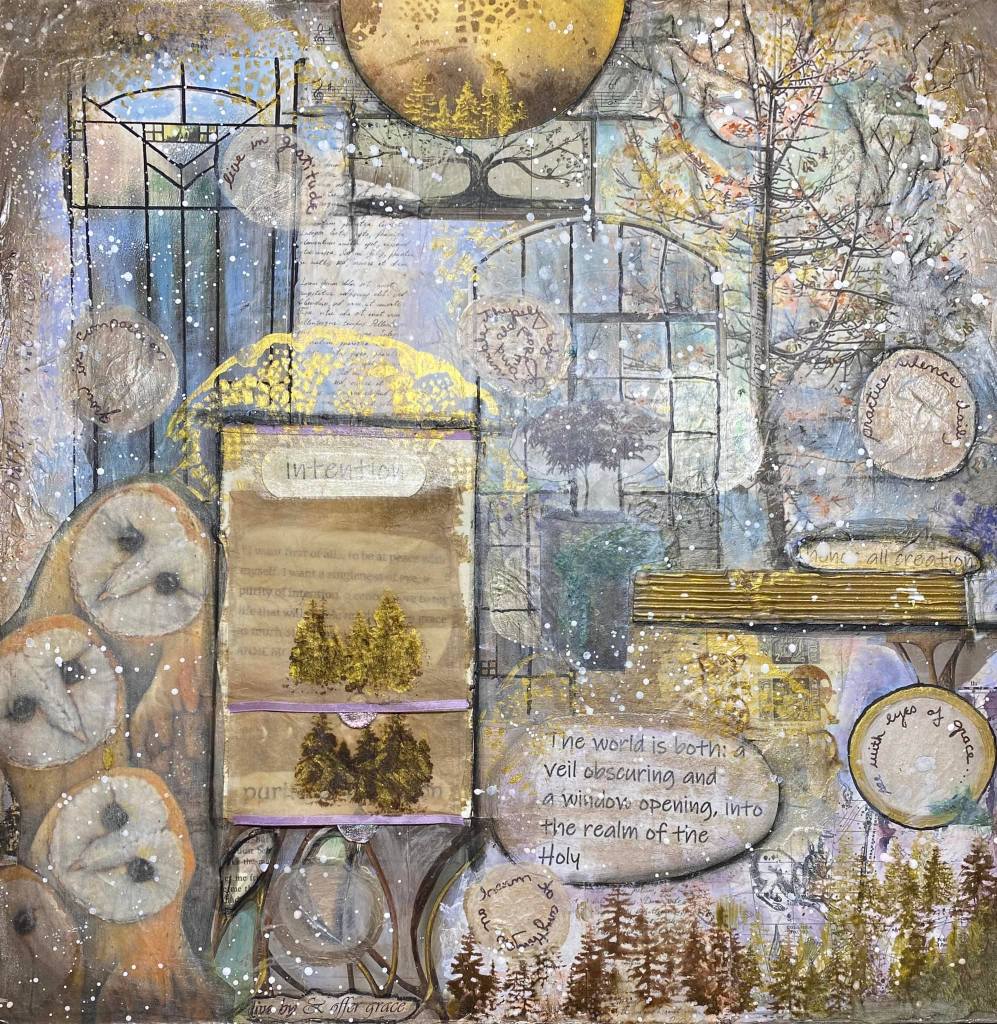 If you could lift the tabs made of teabags on the above piece now hanging on my wall…you’d find a quote by Anne Morrow Lindbergh. (One of many quotes hiding in plain sight). “I want first of all – in fact, as an end to these other desires – to be at peace with myself. I want a singleness of eye, a purity of intention, a central core to my life … in fact – to borrow from the languages of the saints – to live “in grace” as much of the time as possible. By grace I mean an inner harmony, essentially spiritual, which can be translated into outward harmony. I am seeking perhaps what Socrates asked for in the prayer from the Phaedrus when he said, “May the outward and inward (wo)man be at one.” I would like to achieve a state of inner spiritual grace from which I could function and give as I was meant to in the eye of God.” The clarity of her words were at first startling. Yet that quickly passed, as I received them as something to take with me on the journey in 2022 which I’d named for myself just a few weeks earlier as purity of intention. These words from Lindbergh were among the first gifts.
